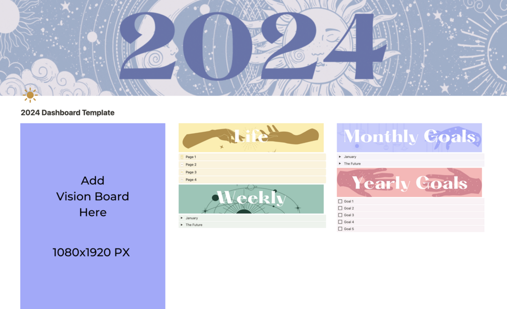 Discover the power of focused vision and turn your ambitions into accomplishments with this 2024 Dashboard. Let your Notion pages resonate with purpose and lead you towards a year of triumph and growth! π±ππ