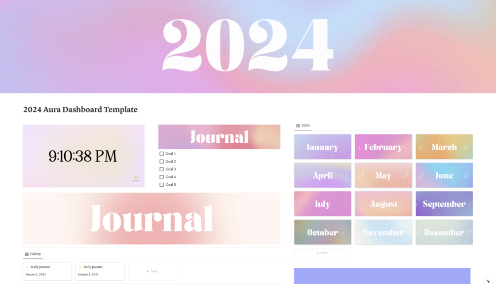 Hey there dream-weaver! Ready to turn your year into a masterpiece? The 2024 Aura Notion Dashboard is here to sprinkle some enchantment into your Notion life, and guess what? It's yours for a mere $1!